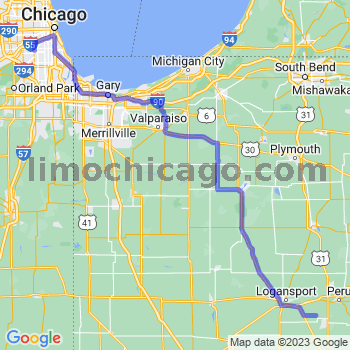 Travel distance from Chicago to Onward, Indiana is 143 and travel time 2 hours 55 mins. During peak hours approaching Chicago downtown can be really slow due to heavy traffic. Windy city has a strange habit of generating heavy traffic during a regular day due to a weather as well as at night time due to construction blockages. So if you are planning a limo trip to the loop for a meeting add a dozen of minutes or two on top of this travel time. Just to be safe ;).